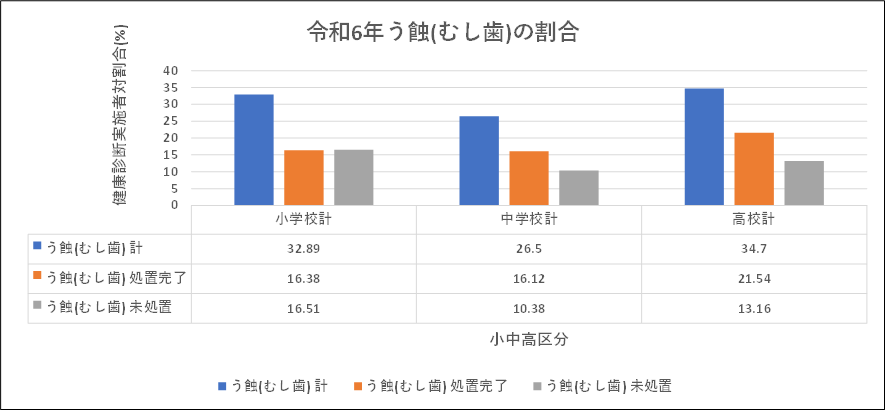令和6年の小学校,中学校,高等学校の歯科検診で3割前後の学童・生徒にう蝕がありました。未処置で放置されていることも少なくありません。(註1)