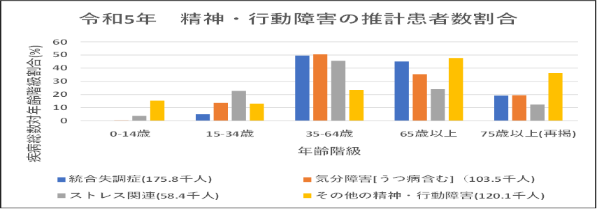 図にライフステージ別に推計患者数を示しました。35-64歳,65歳以上に気分障害(うつ病含む),統合失調症,ストレス関連の患者数が多いことが目立っています。(註2)